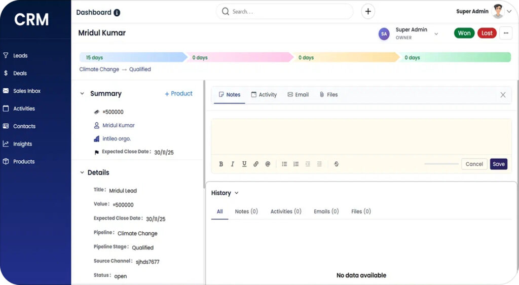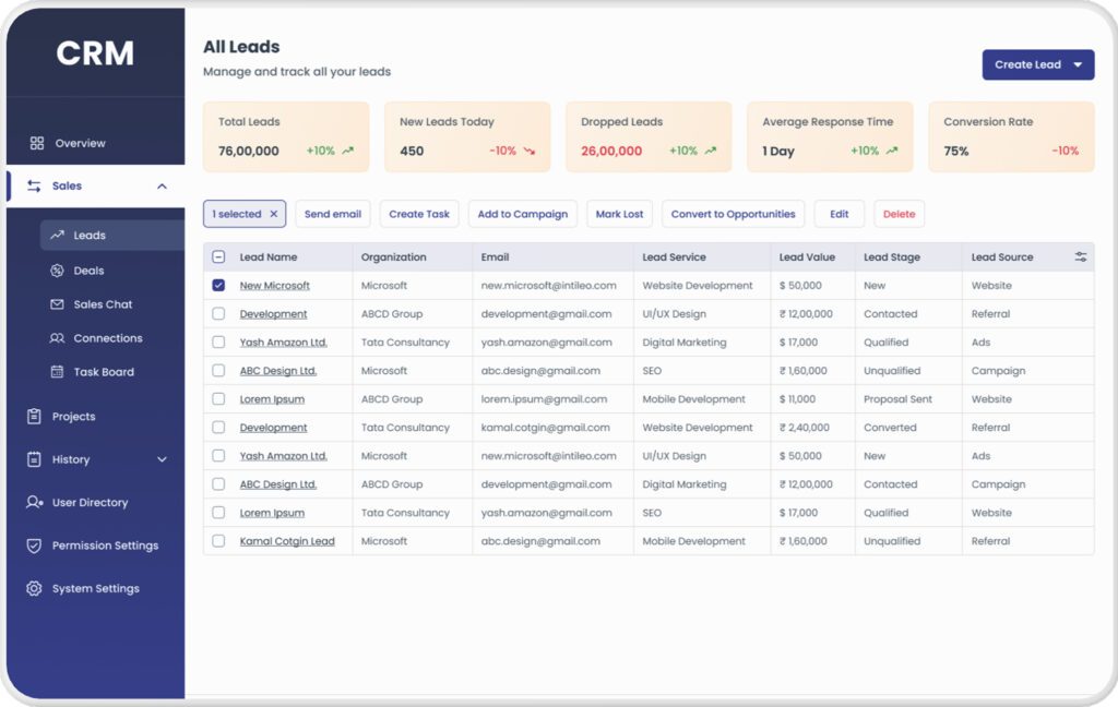 Transform data into actionable insights with comprehensive analytics and customizable reports. Monitor key metrics like conversion rates, deal size, and revenue trends through visual dashboards. Moreover, Track team performance, generate custom reports, and identify your best lead sources. Further, Make confident, data-driven decisions that accelerate growth.